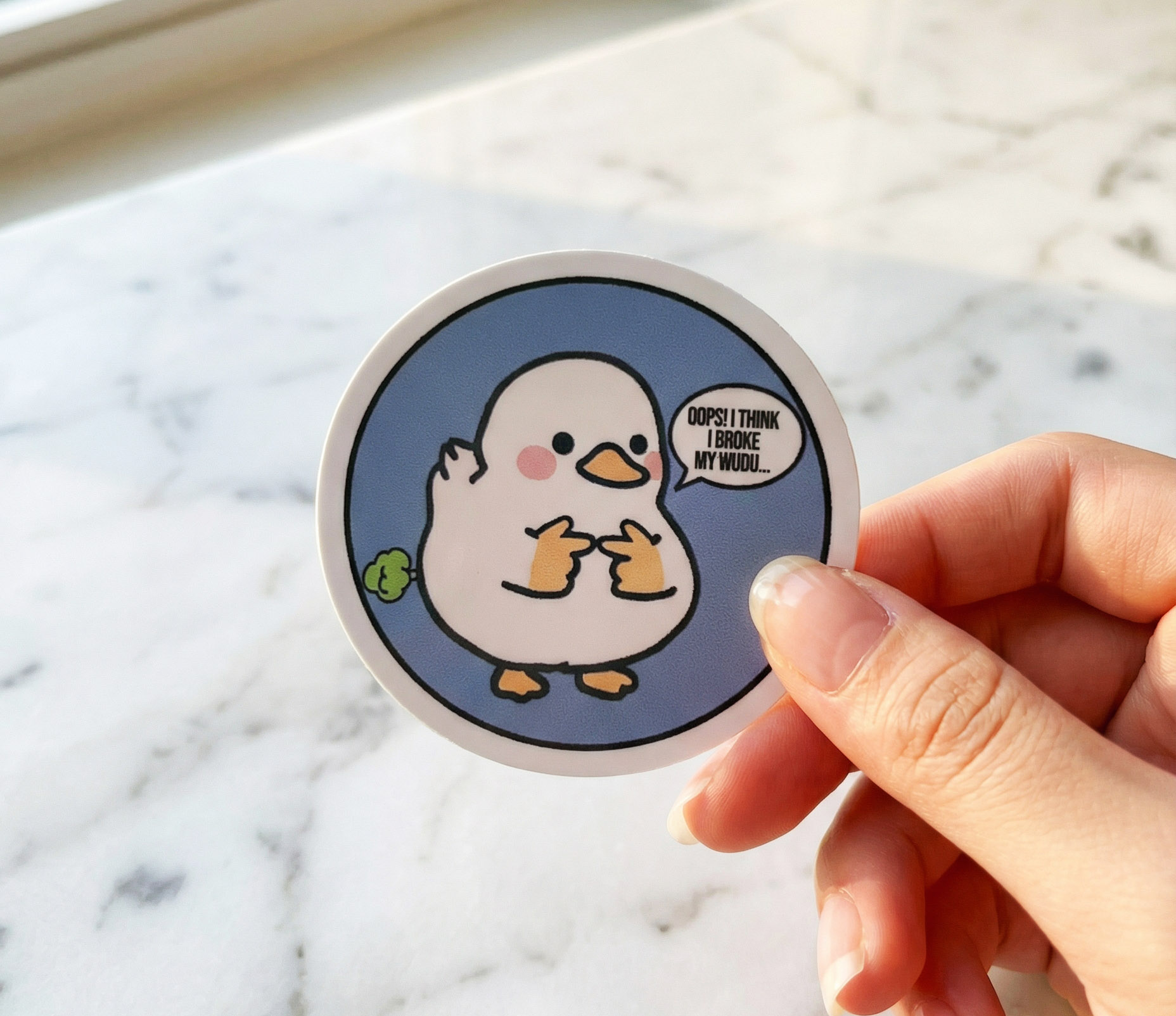 A cheeky halal-humour reminder about staying on top of wudu. Our bashful duck admits, “Oops! I think I broke my wudu…” — perfect for phones, laptops, water bottles and journals. Light-hearted, modest and very giftable.