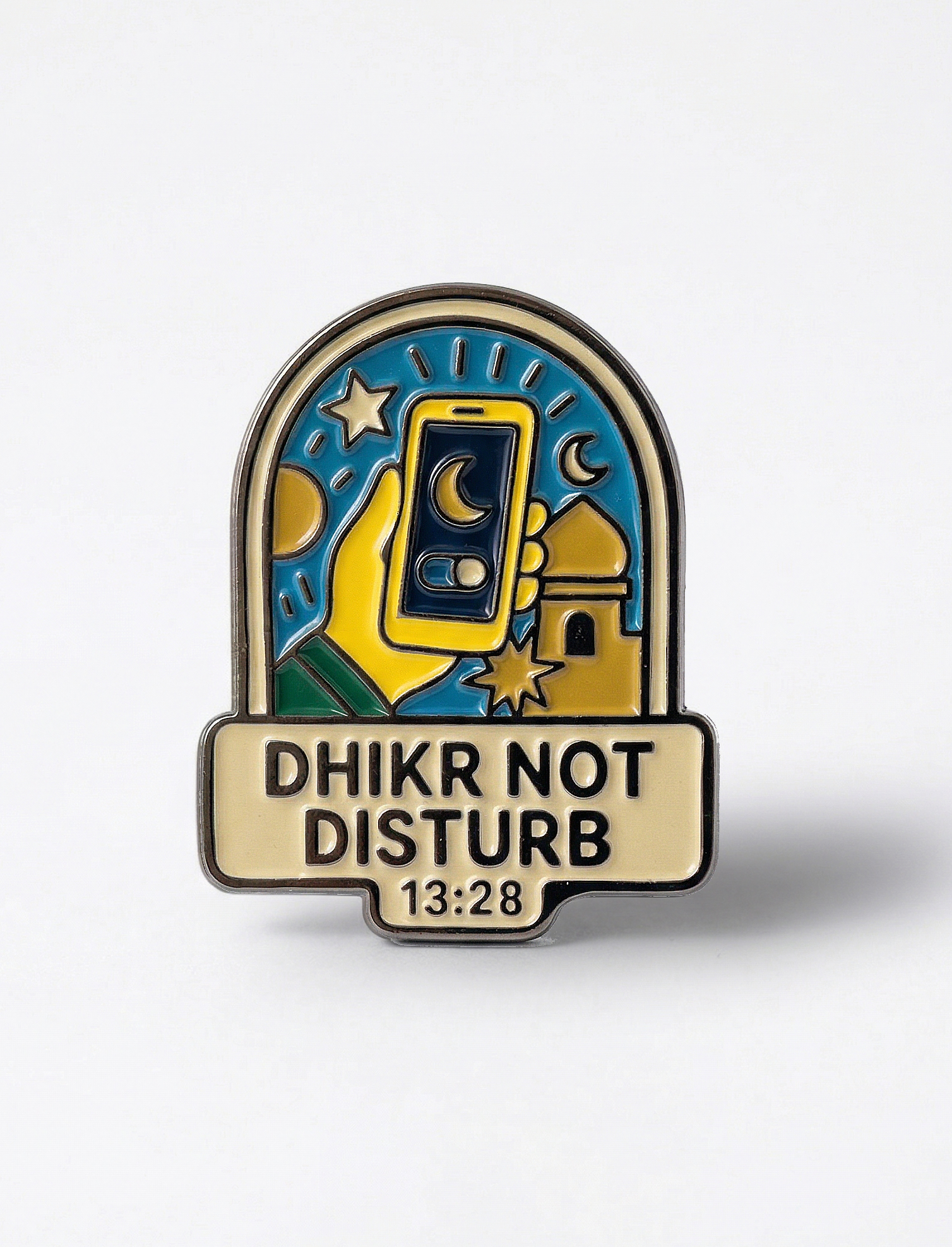 This “Dhikr Not Disturb” enamel pin is the perfect mix of modern and spiritual. It features a hand holding up a phone with a crescent moon on the screen, framed in a cosy night-sky arch with stars and a little masjid silhouette in the background. At the bottom, a banner reads “DHIKR NOT DISTURB – 13:28” as a nod to the verse about hearts finding rest in the remembrance of Allah.