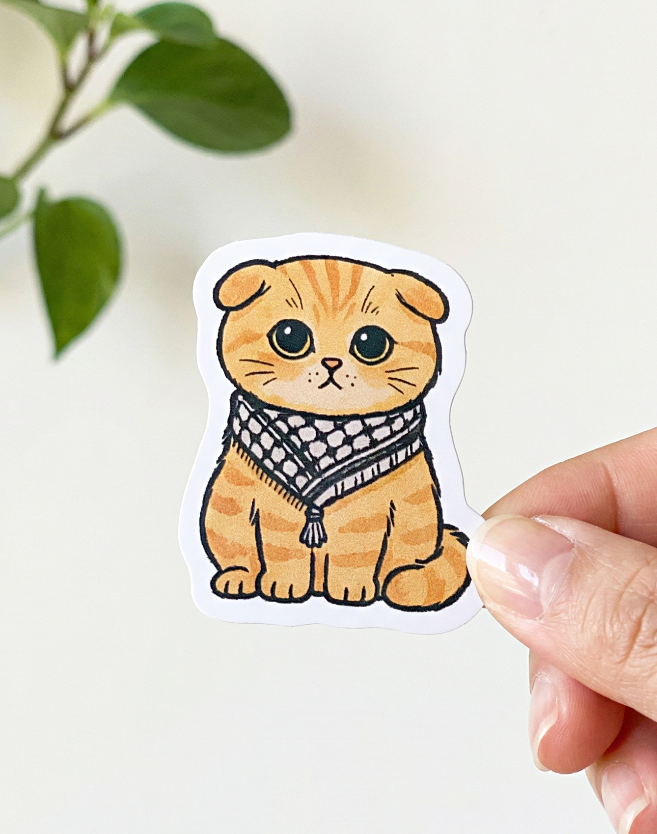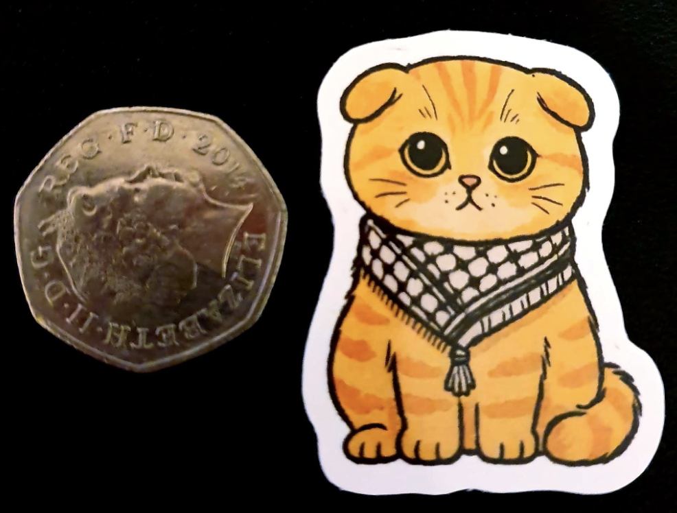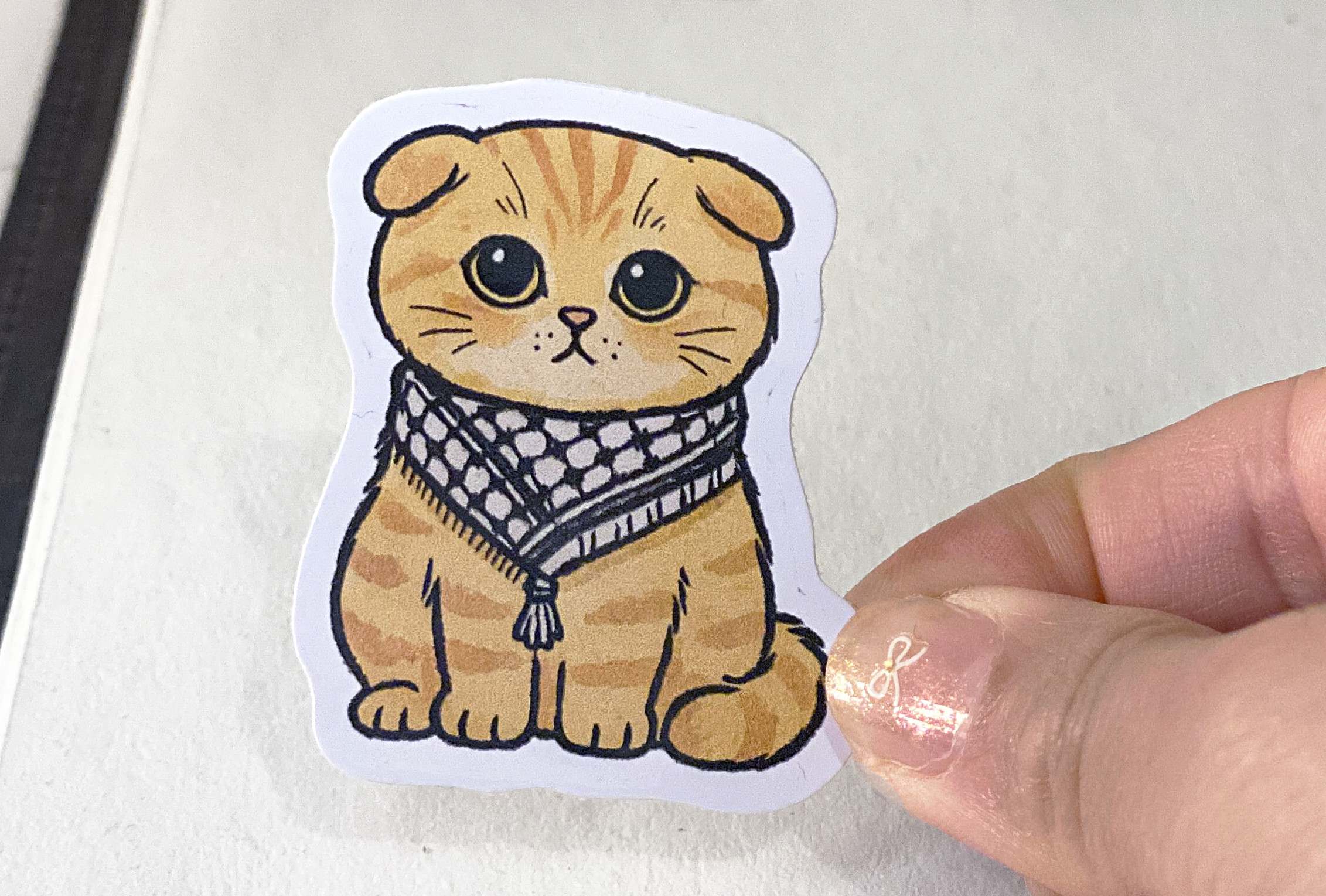 Big eyes, bigger heart. This ginger Scottish Fold wears a keffiyeh-pattern scarf – cosy, cute and a gentle nod of solidarity for Palestine. Perfect for phones, laptops, water bottles and journals. A lovely pick for cat people and fans of warm, hand-drawn art.
